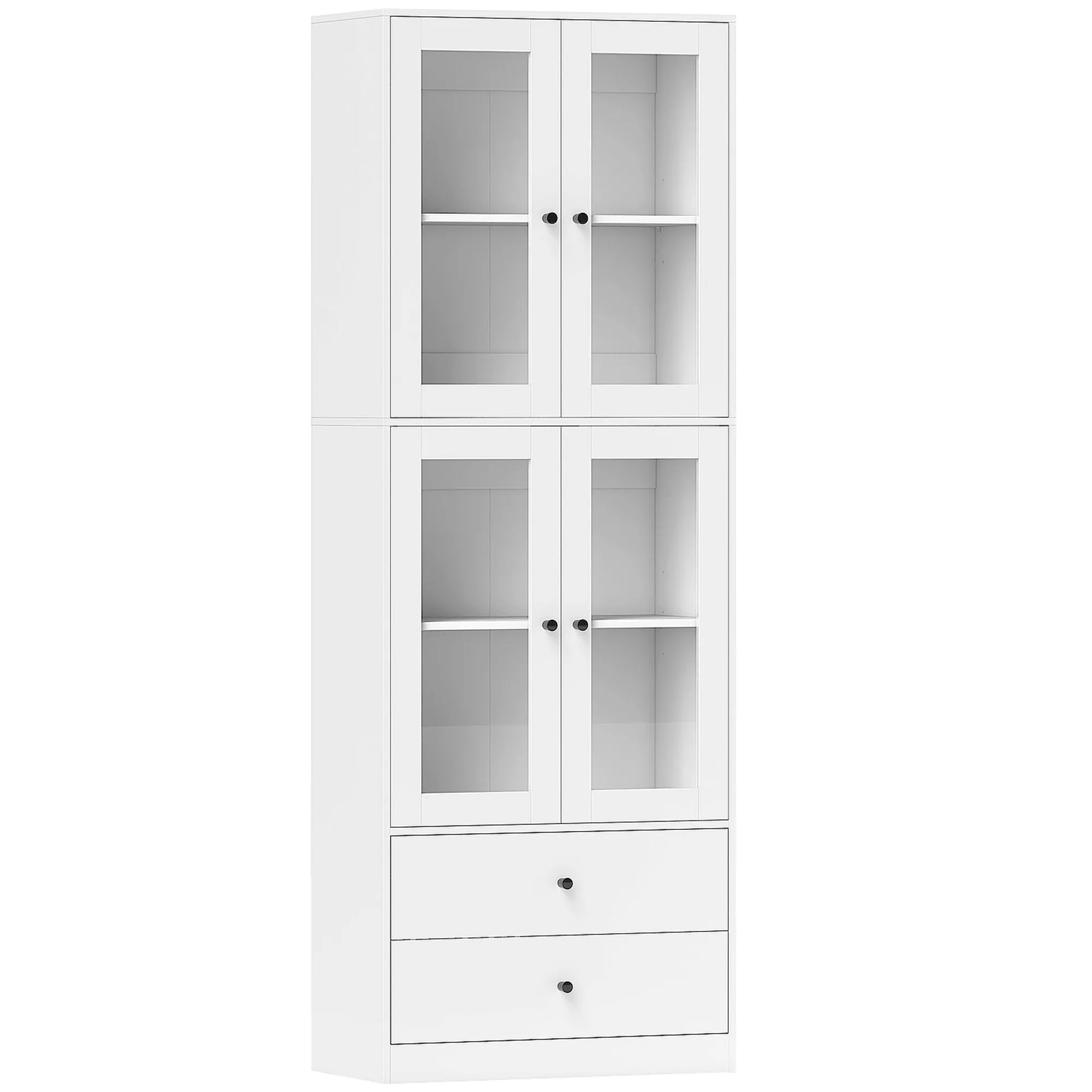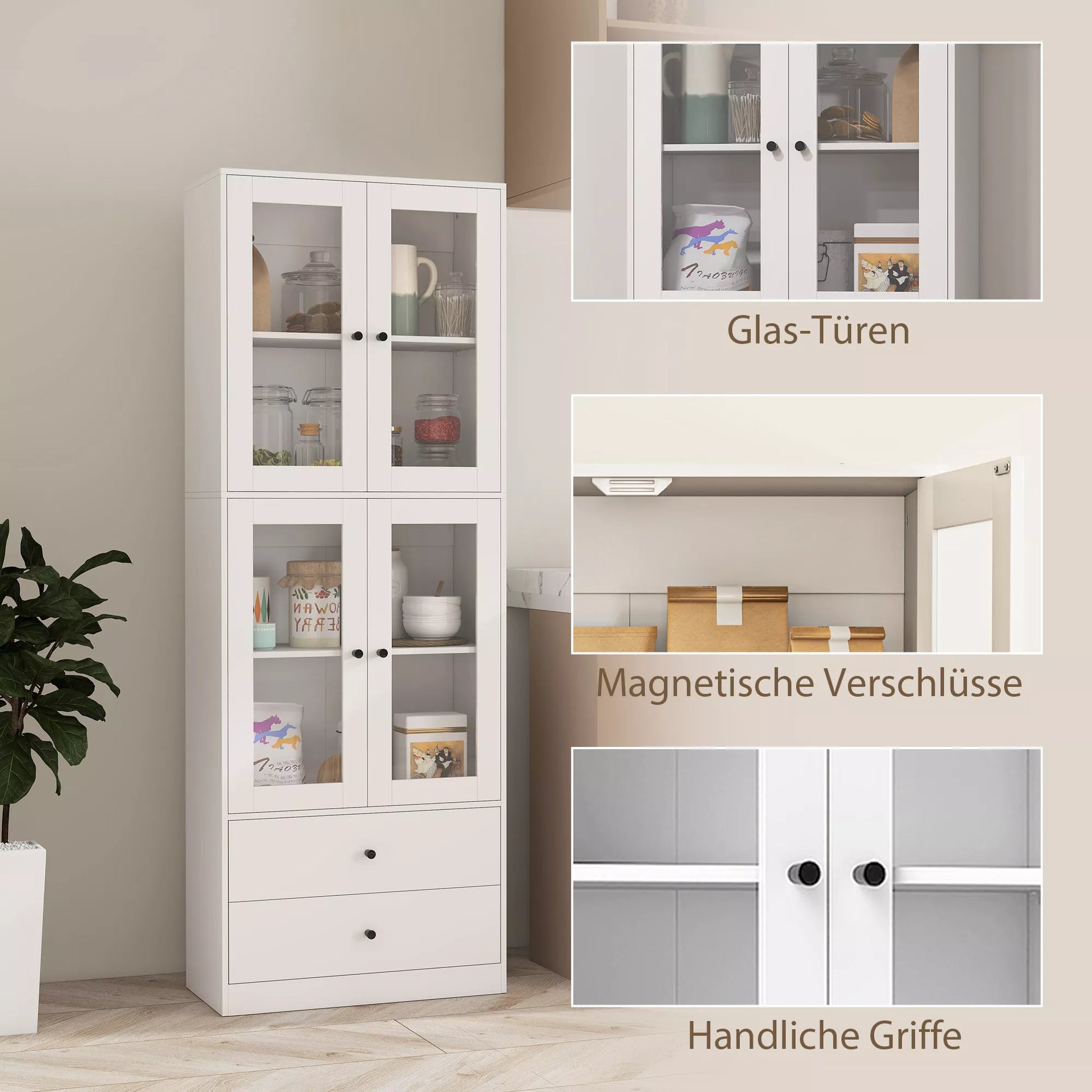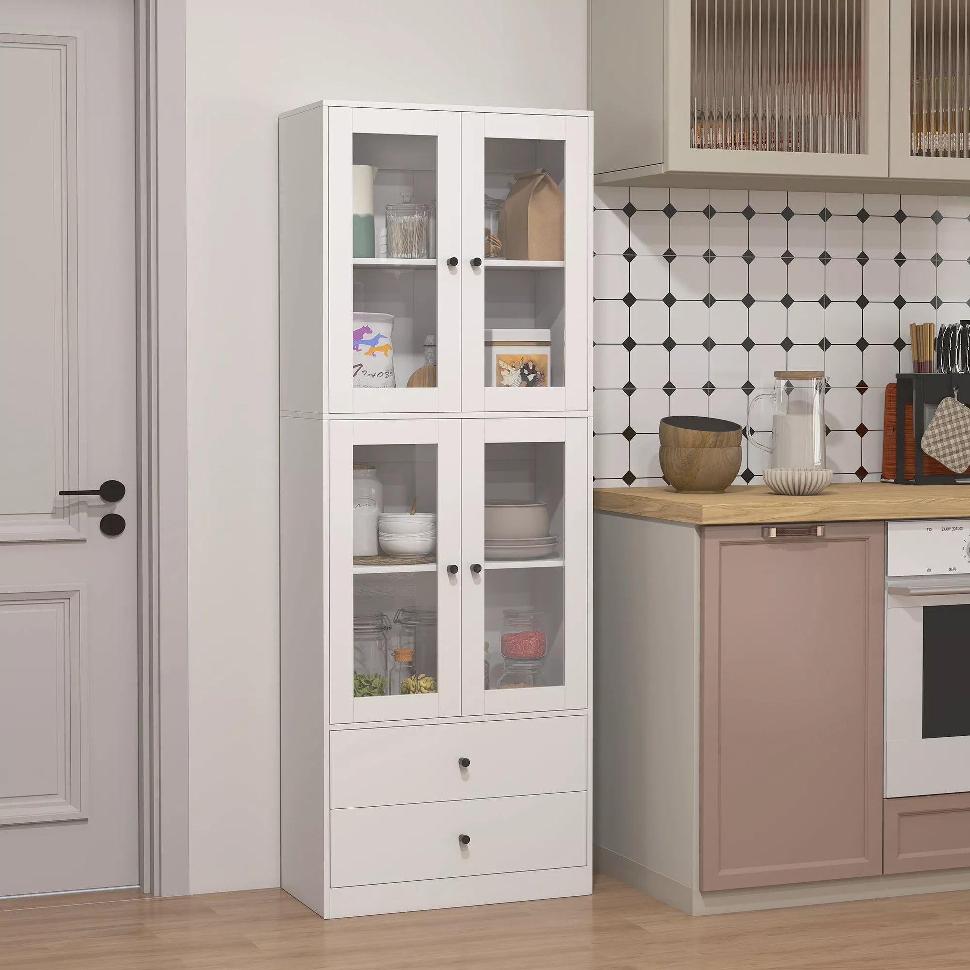 Virtuvės spinta su stalčiais ir stiklinėmis durimis, balta, melamino paviršius