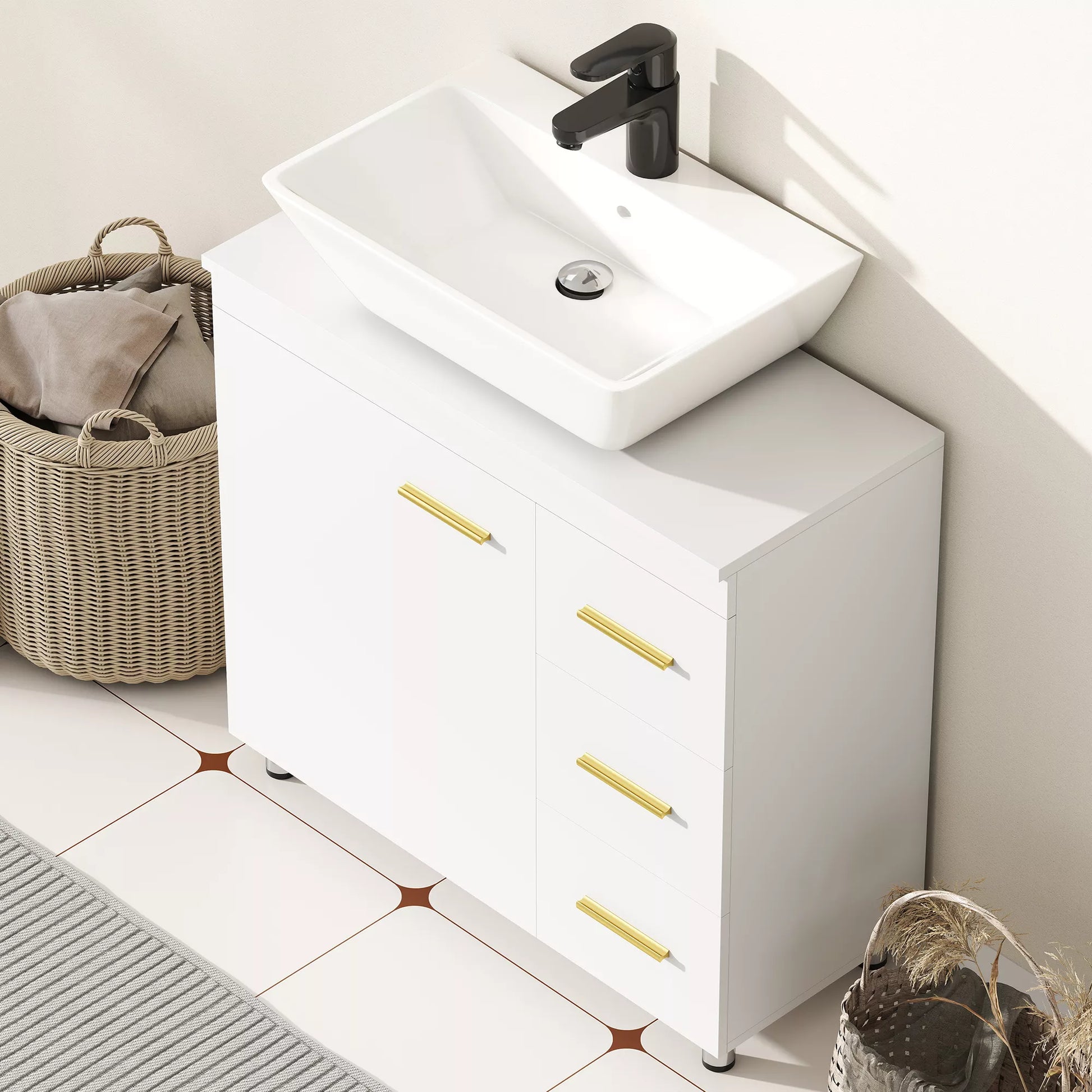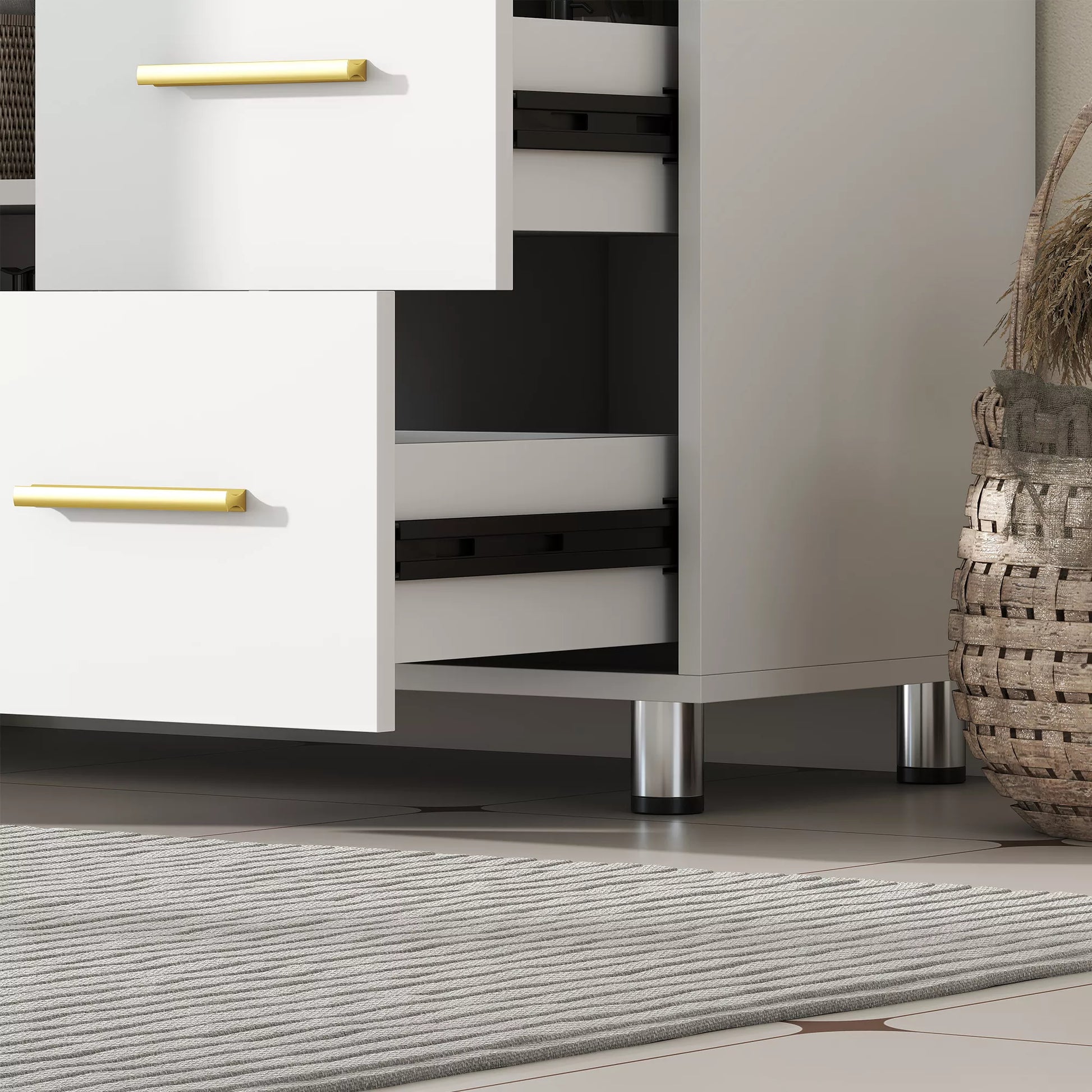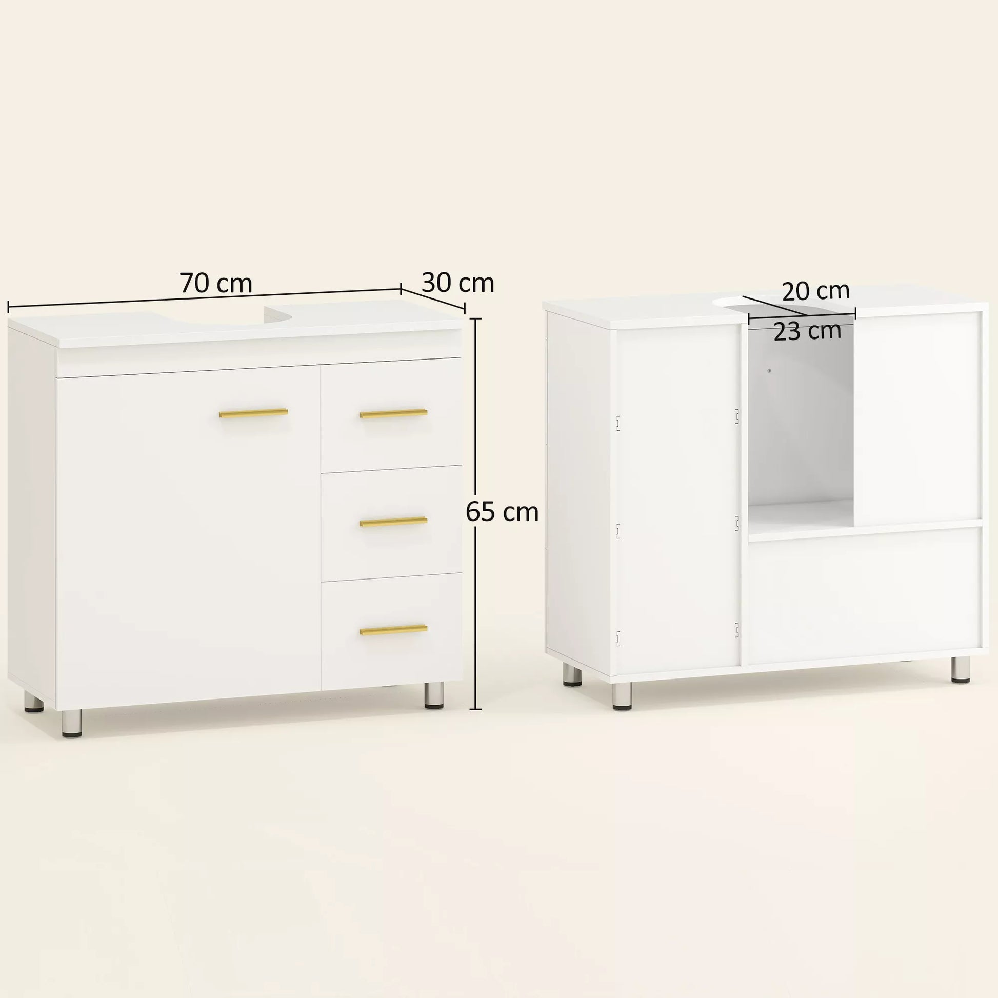 - ✔ Skaidri balta išvaizda, papuošta prašmatniomis aukso spalvos rankenėlėmis, suteikia modernios elegancijos