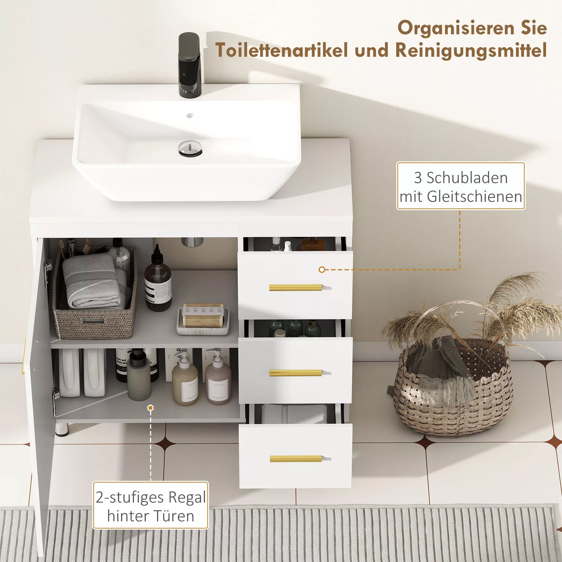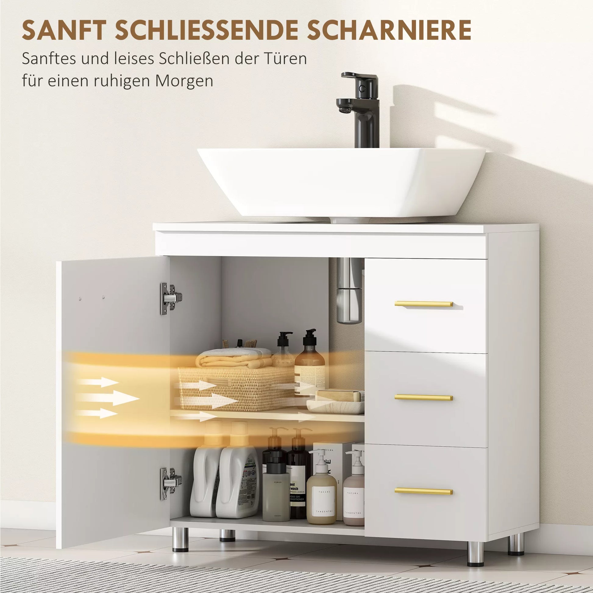 Ar pavargote nuo netvarkos prie praustuvo? Šis spintelės po praustuvu dizainas išnaudoja laisvą erdvę, taupo vietą ir suteikia daug saugojimo vietos. Tinka po dauguma praustuvų – su arba be atraminės kolonos. Viduje yra trijų lygių skyrius ir trys stalčiai higienos reikmenims ir valymo priemonėms laikyti. Vonios spintelės tylūs „Soft-Close“ vyriai užtikrina ramybę kasdieniame gyvenime – be bildėjimo, be streso. Mažas atnaujinimas, didelis poveikis.