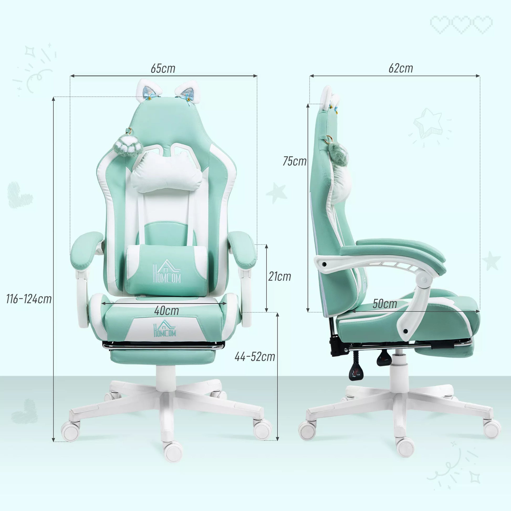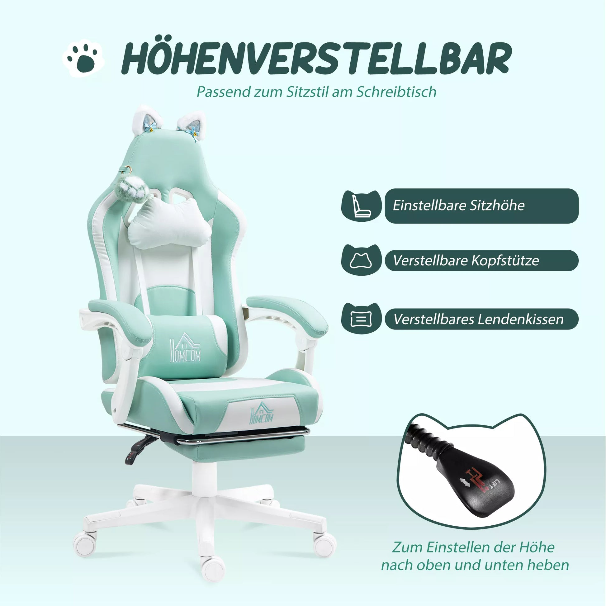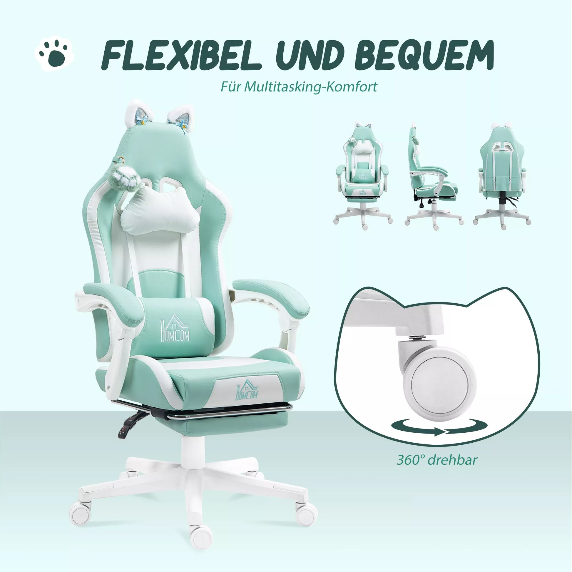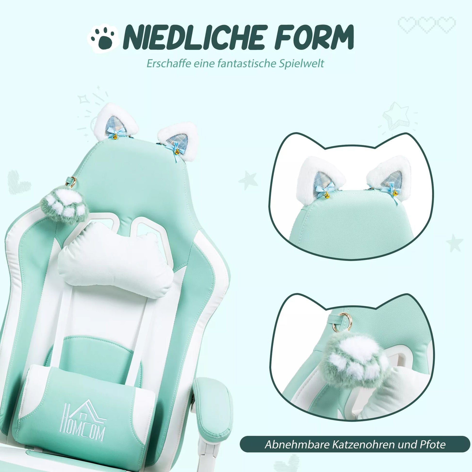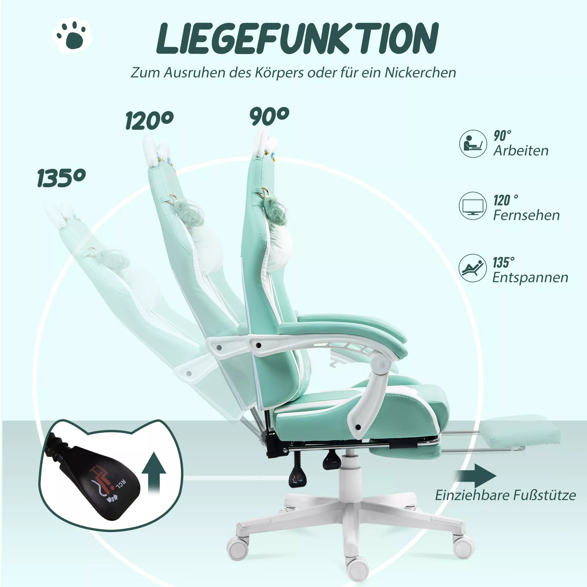Patirkite didžiausią komfortą ir susikaupimą žaisdami su žaidimų kėde su atrama kojoms. Žaismingos katės ausys ir letenėlės suteiks jūsų žaidimų kampeliui žavingą akcentą. Mėgaukitės optimaliu paminkštinimu, apgaubtu lengvai prižiūrimu dirbtiniu odos paviršiumi. Reguliuokite sėdėjimo aukštį nuo 44 iki 52 cm ir atloškite nugarą iki 135°. Ištraukiama atrama kojoms ir sujungtos porankiai užtikrina maksimalų patogumą net ilgos žaidimo sesijos metu.