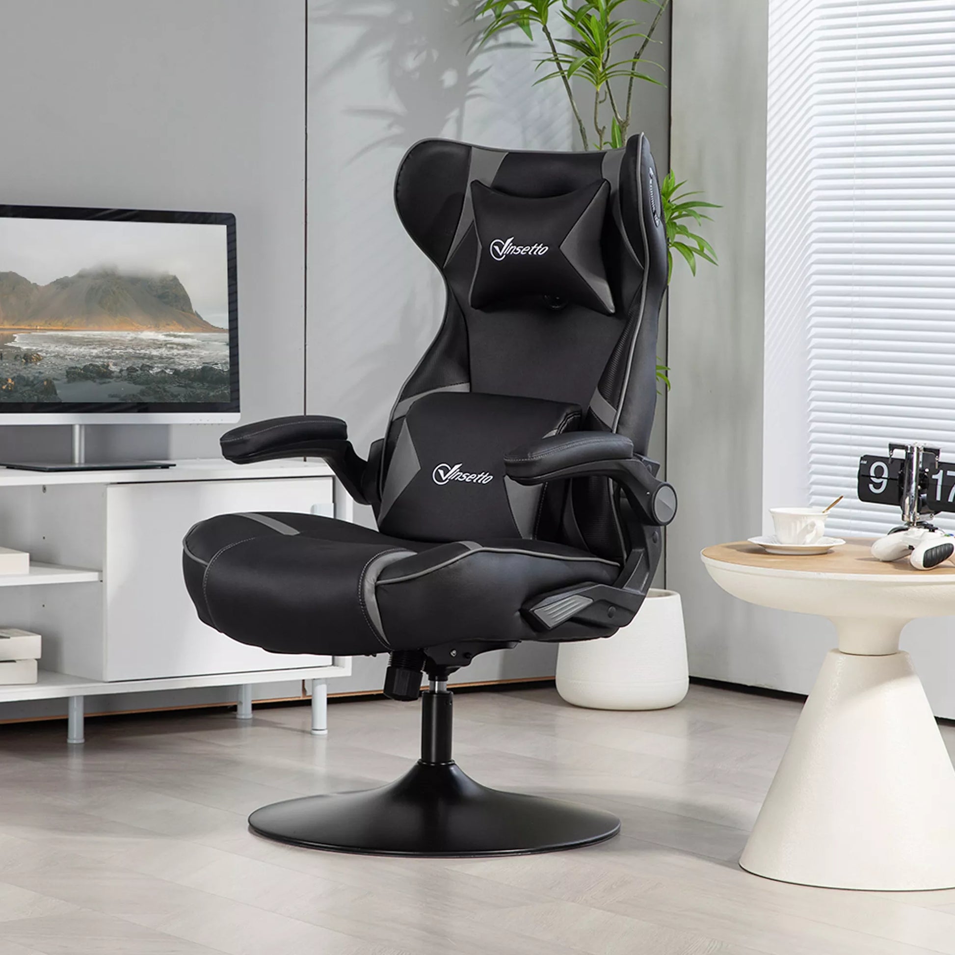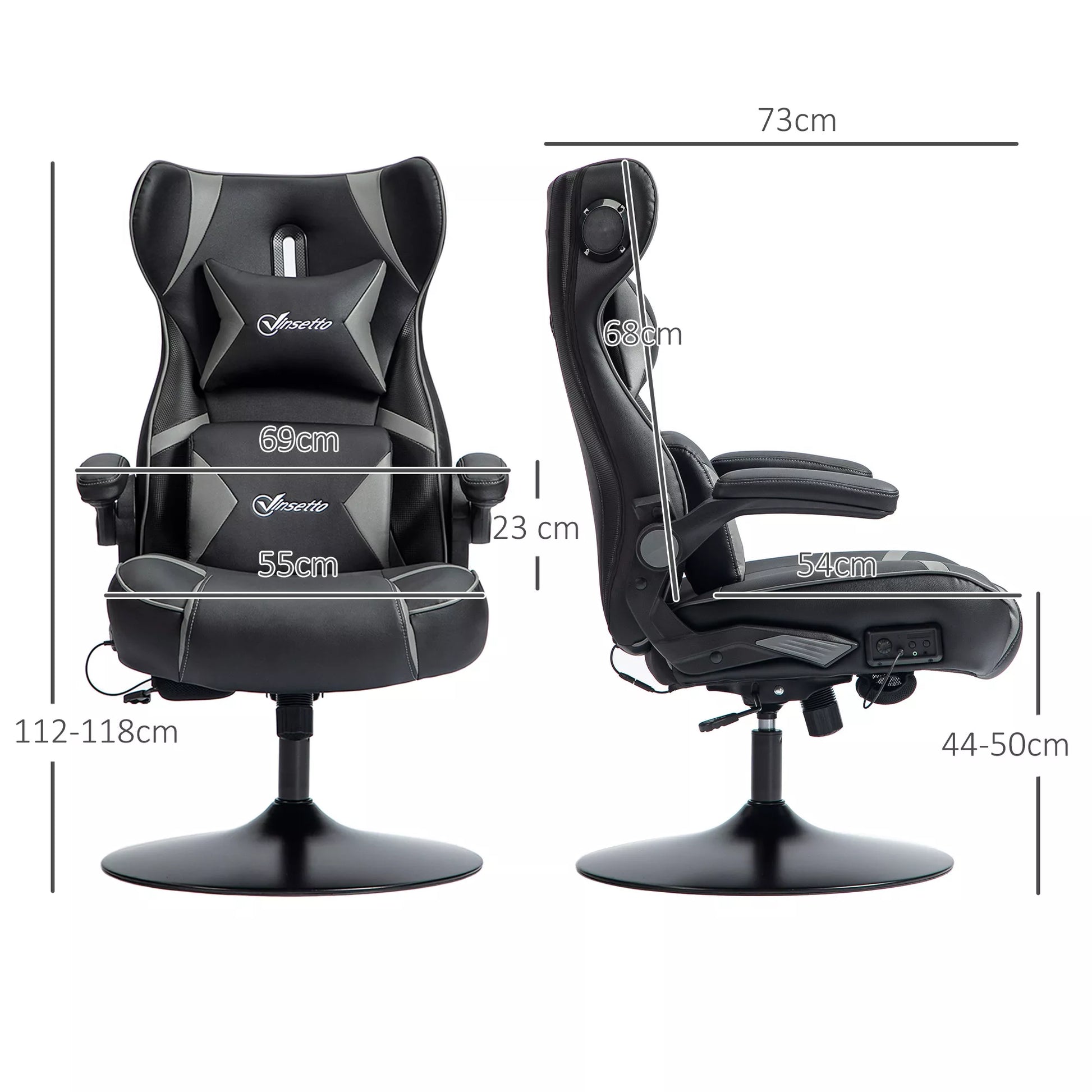 Žaidimų kėdė su supimosi funkcija ir garsiakalbiu, juosmens ir kaklo atrama, žaidimų kambariui, dirbtinė oda, pilka + juoda